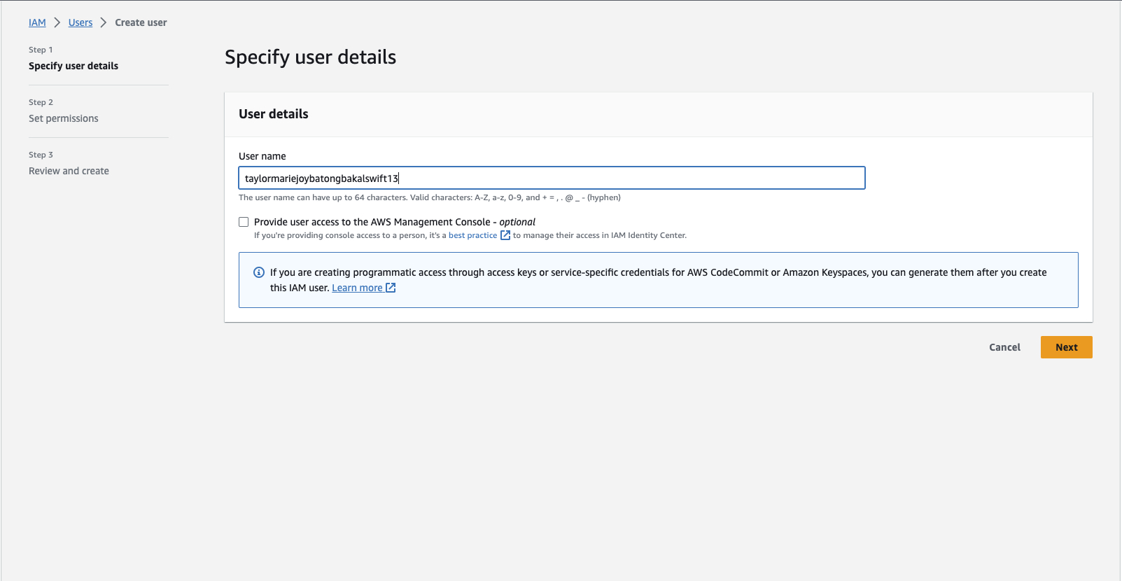 1-d Enter the user name of the IAM User you are creating. This will be used by the user to login to the AWS Management Console