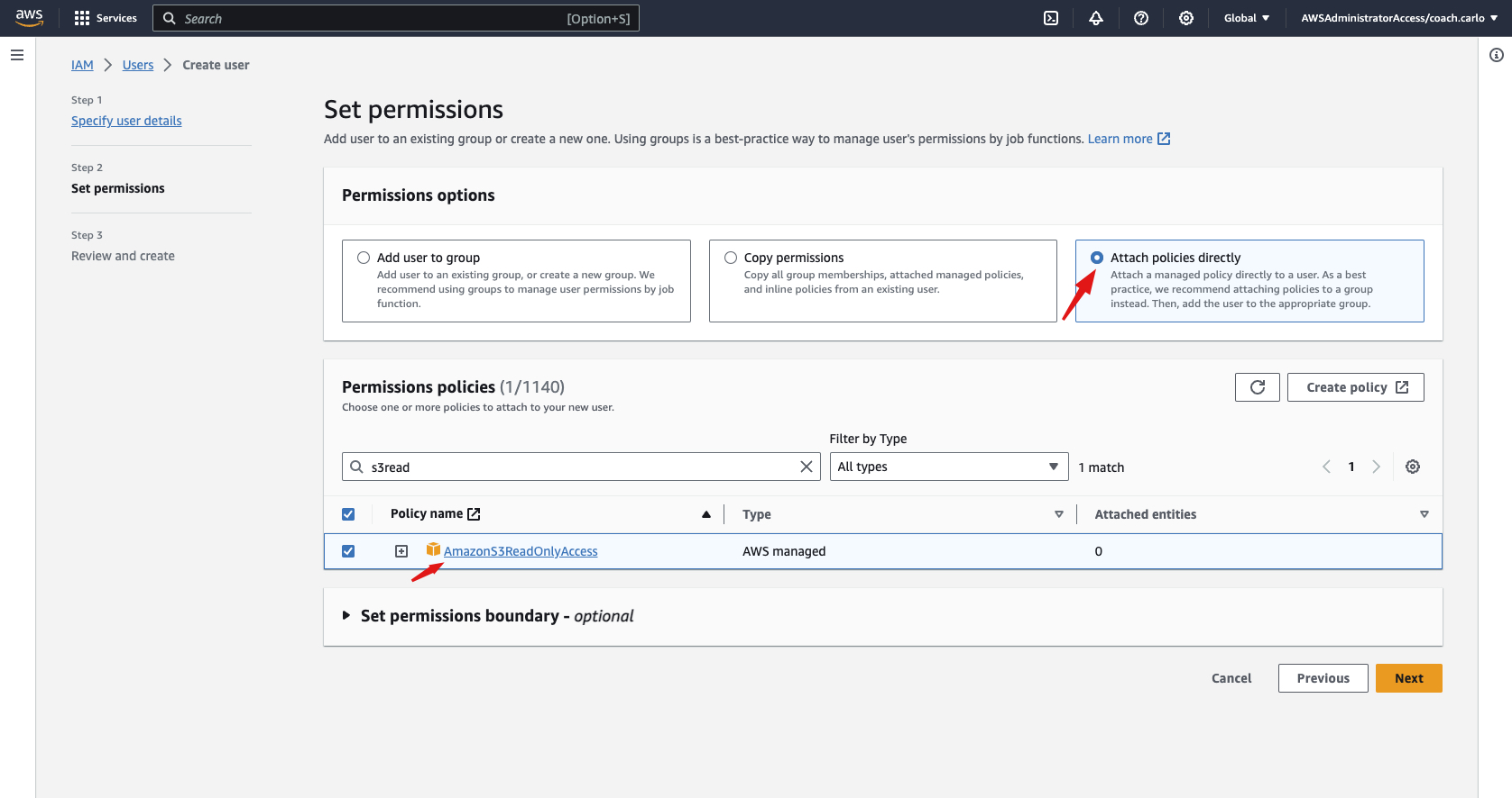 1-f Choose the AmazonS3ReadOnlyAccess on the permission policies to be given to the user you are creating.