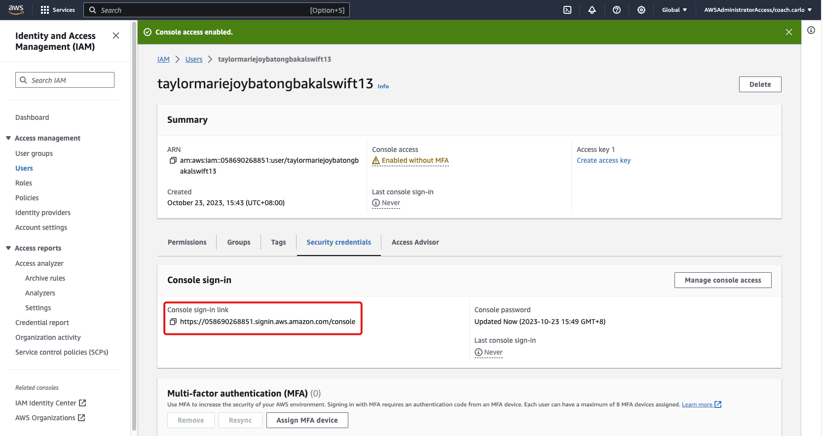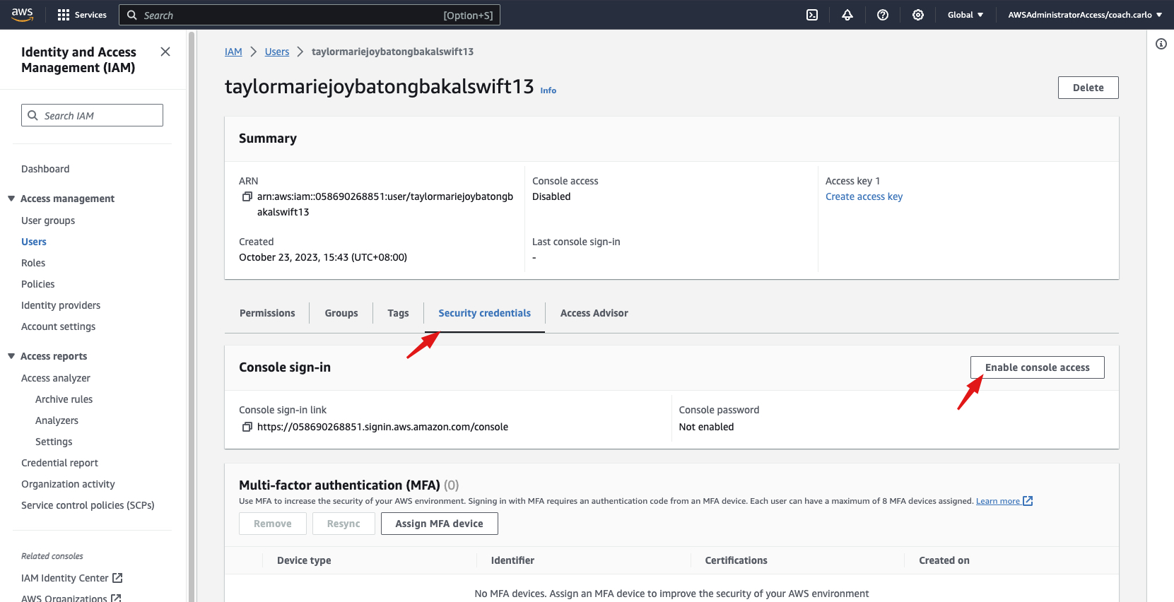 2-b Choose the security credentials tab and click "Enable console access"