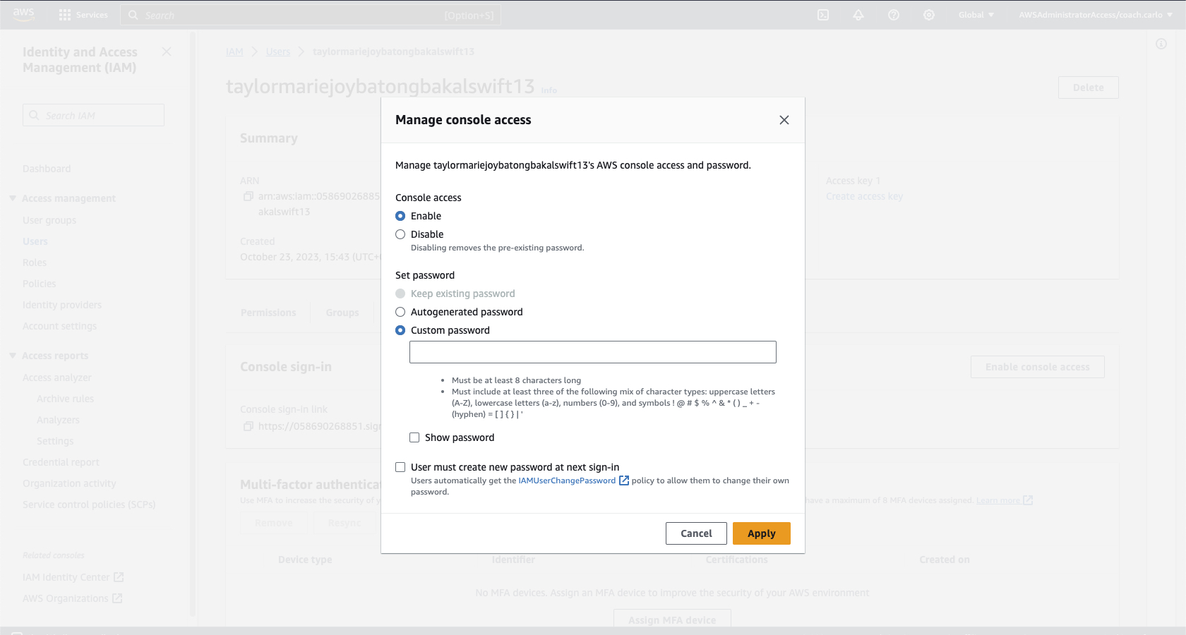 2-c Choose to enable console access for the user. You can choose to create a custom password for the user or an autogenerated password. You can also tick the box that makes the user create a new password at next sign-in to make their account more personalized and protected.