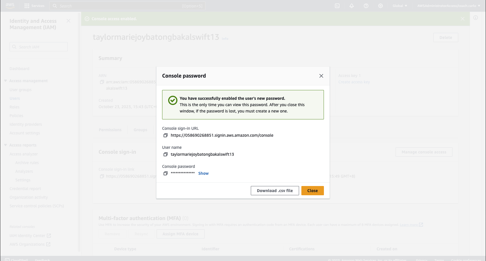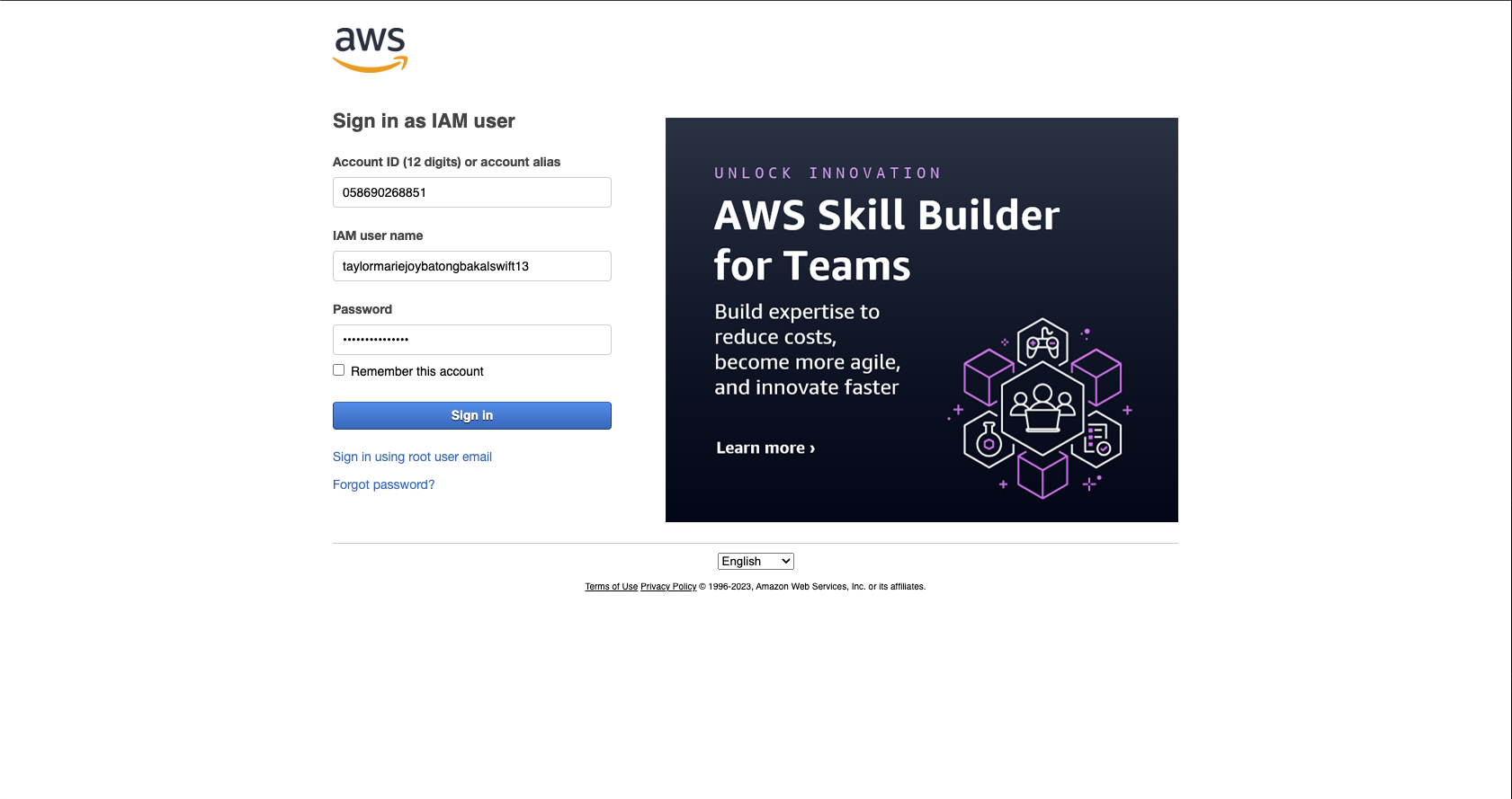 3-a Back on the users page, you will see a console sign-in link. Open a new incognito browser tab so that you can sign in as the IAM User. Fill up the needed information: user name and password and click the "Sign in" button.
