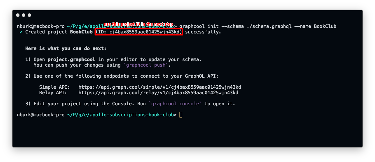 From the terminal output, you need to grab the project ID and use it in the next step. This ID is also available in the generated project file project.graphcool.